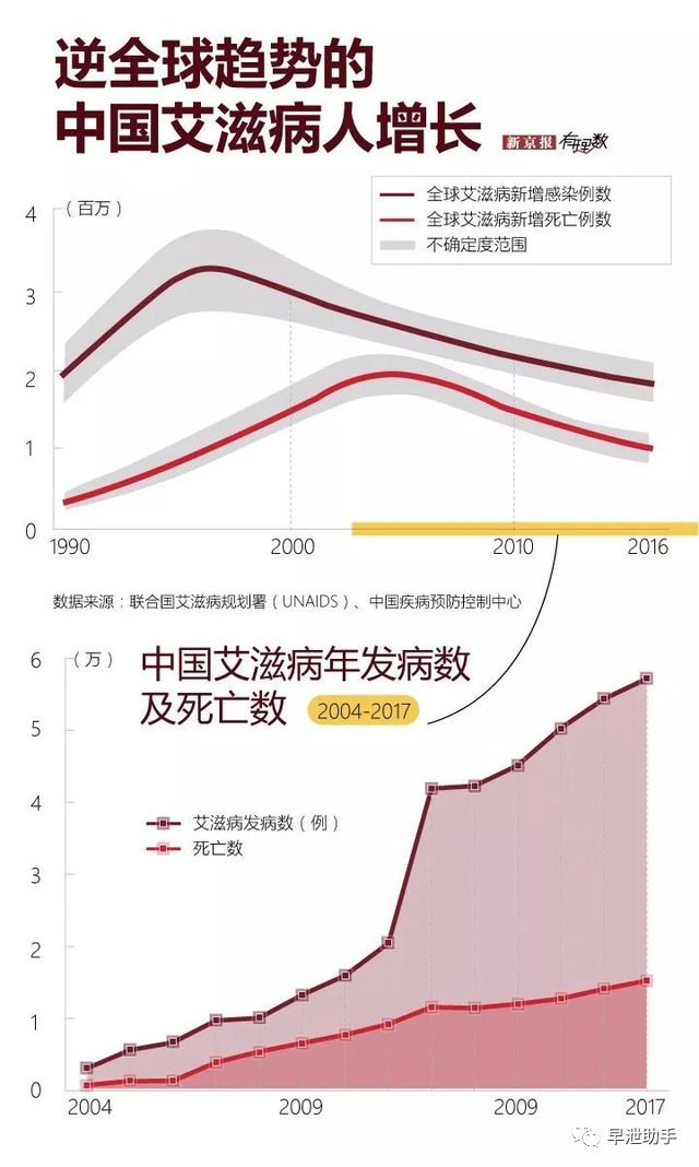 2017年,我国新发现的HIV感染者有13.5万,较2012年上升了64%。而在2016年,全球新增的艾滋病毒感染人数为180万人,新增人数比2000年下降了39%。